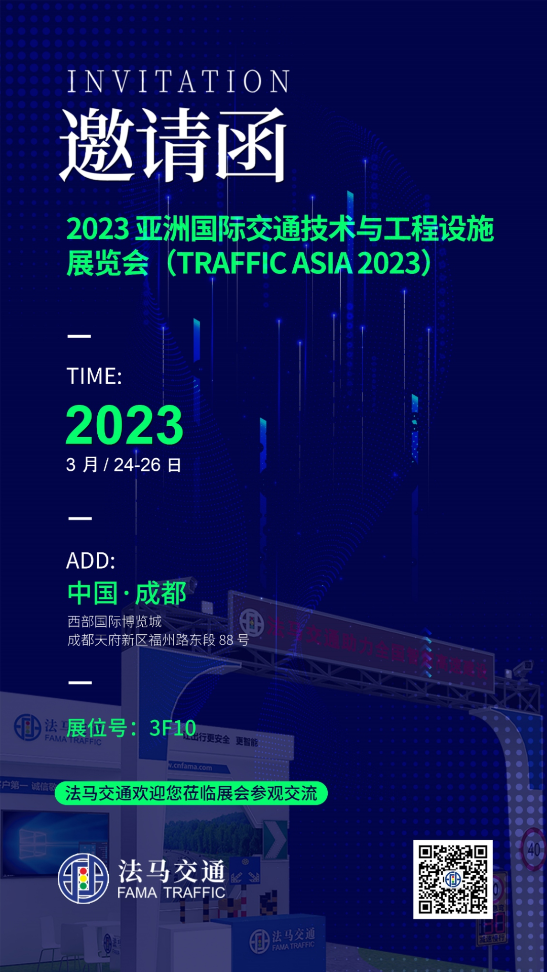 2023年亞洲國際交通技術(shù)與工程設(shè)施展覽會( TRAFFIC ASIA 2023 )將于3月24日-26日在(成都)西部國際博覽城舉辦,本屆展會以“新技術(shù)、新動能、新格局”為主題。作為一家集產(chǎn)品設(shè)計、研發(fā)、生產(chǎn)、銷售和服務(wù)于一體的智慧交通解決方案供應商,法馬交通受邀出席本次展會。