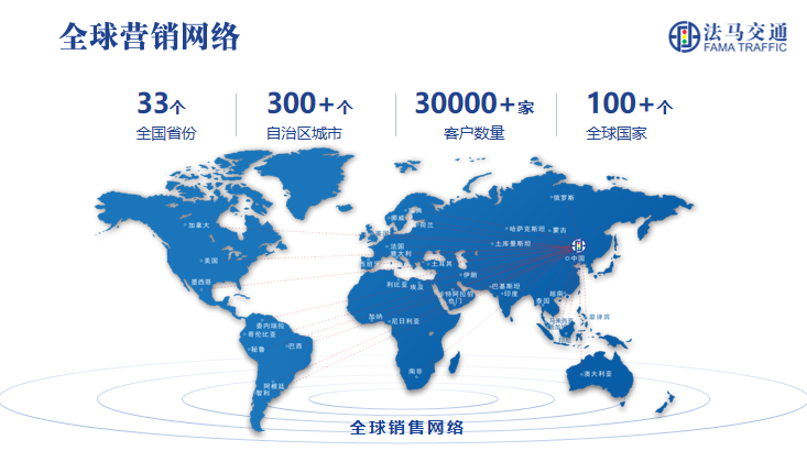 作為一家專注智慧交通整體解決方案提供商及服務(wù)商,法馬交通集設(shè)計(jì)、研發(fā)、生產(chǎn)、銷售、服務(wù)于一體,致力于智慧交通建設(shè),產(chǎn)品覆蓋智能信號(hào)控制機(jī)系列、智能LED交通燈系列、智能信號(hào)標(biāo)志系列和智能多功能燈桿系列。目前,法馬交通業(yè)務(wù)遍布全國(guó)33個(gè)省、直轄市和自治區(qū),涉及300多個(gè)城市,擁有數(shù)萬(wàn)家用戶;海外業(yè)務(wù)市場(chǎng)覆蓋150多個(gè)國(guó)家,超過近20000個(gè)交通工程,為市場(chǎng)提供一站式智能交通解決方案。