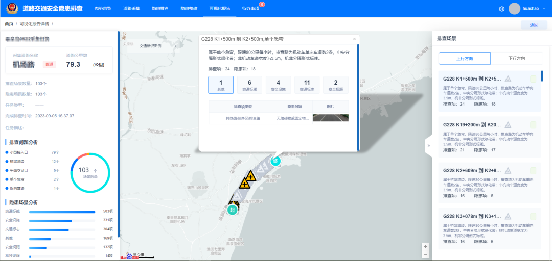 依照國家行業(yè)相關(guān)標(biāo)準(zhǔn)規(guī)范,建立標(biāo)準(zhǔn)化、精準(zhǔn)化的排查流程及方法,對道路隱患依次排查。通過可視化、數(shù)據(jù)看板等手段再現(xiàn)道路隱患點位的既往數(shù)據(jù)、現(xiàn)在實際情況以及整改后的效果。