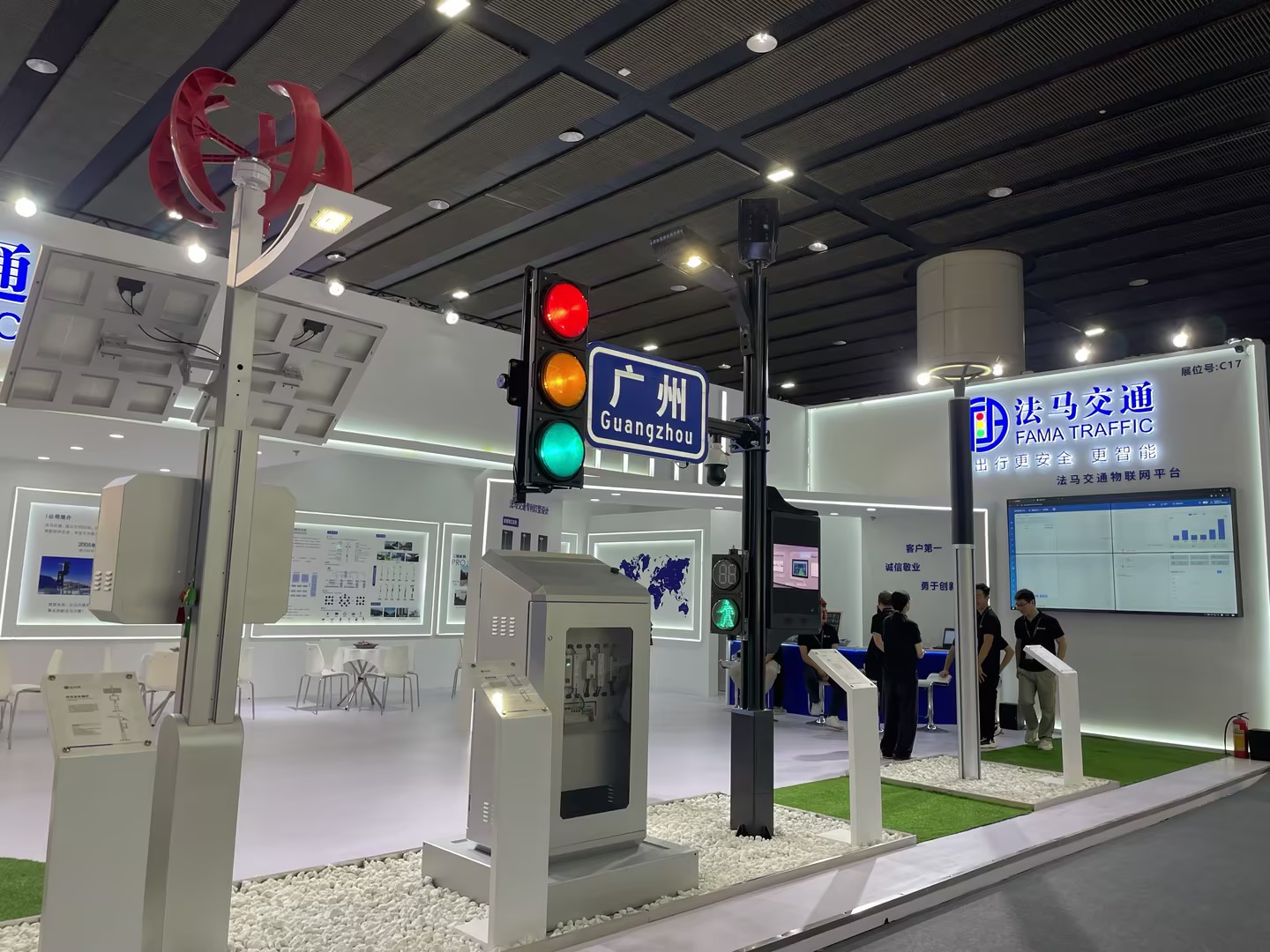A區(qū)3.1展廳C17號展位,法馬交通展示了多款產(chǎn)品及解決方案,包括智慧合桿、柔性太陽能路燈、風(fēng)光互補(bǔ)路燈、智能庭院燈、綜合機(jī)柜、物聯(lián)網(wǎng)平臺聯(lián)動演示。