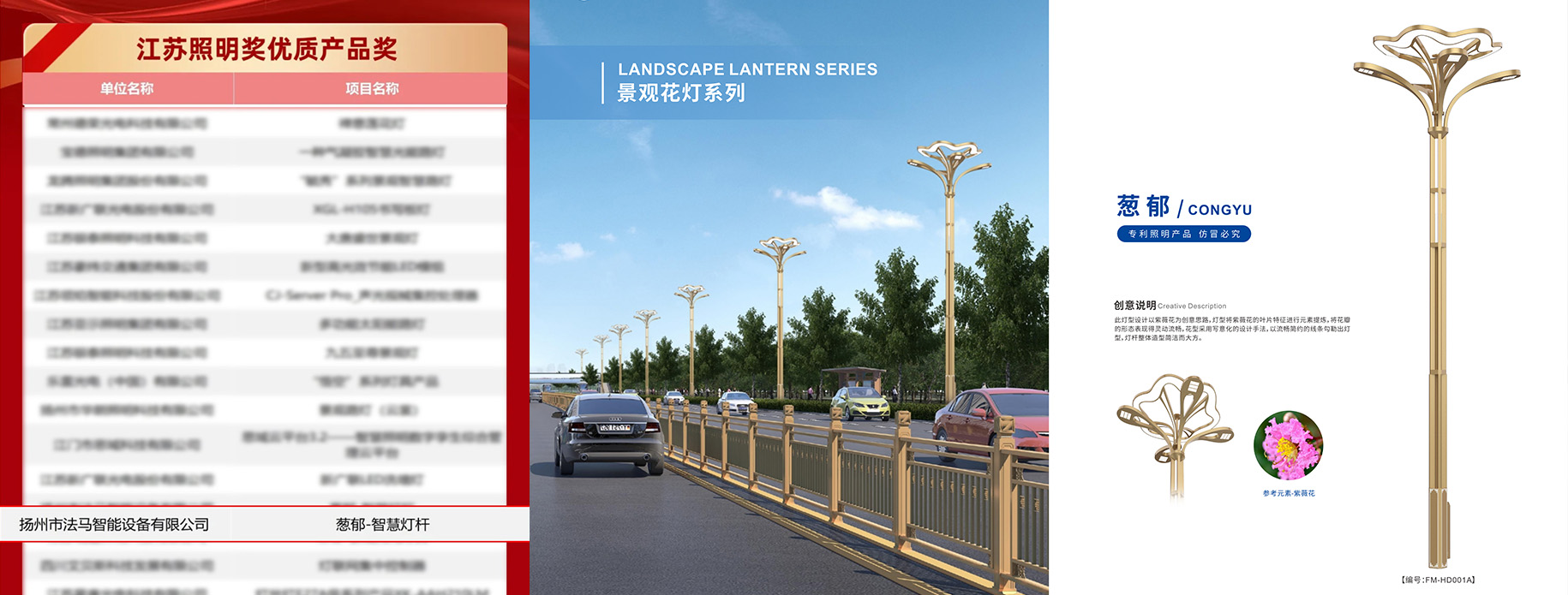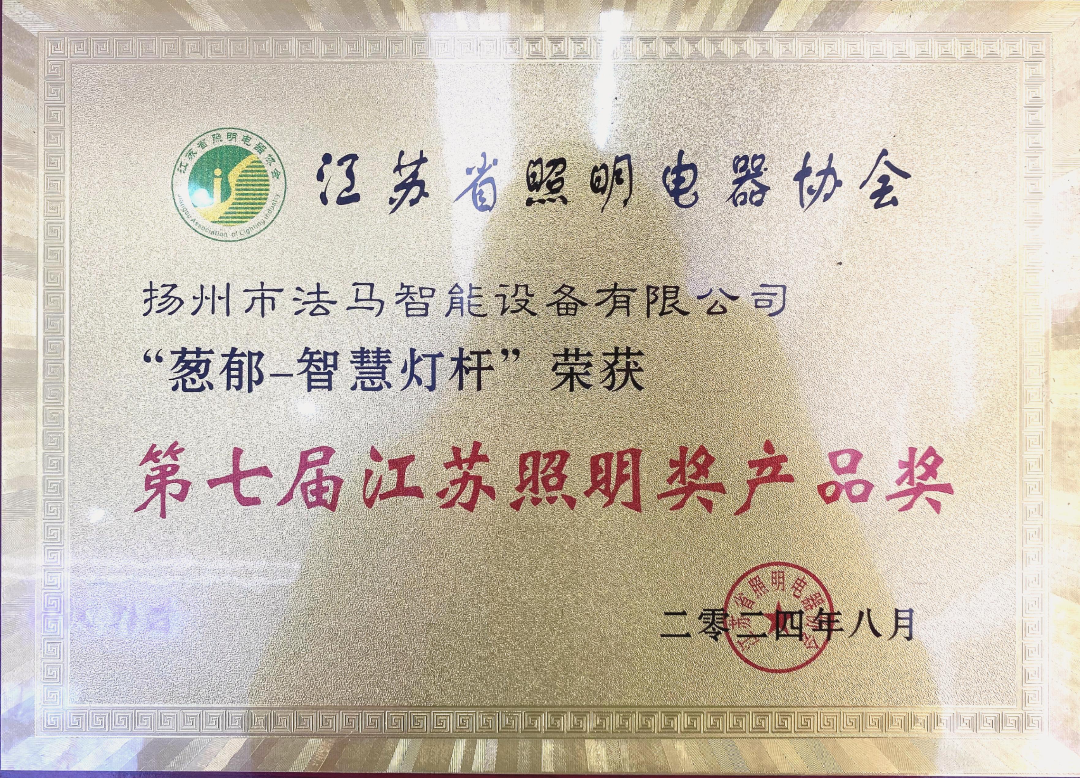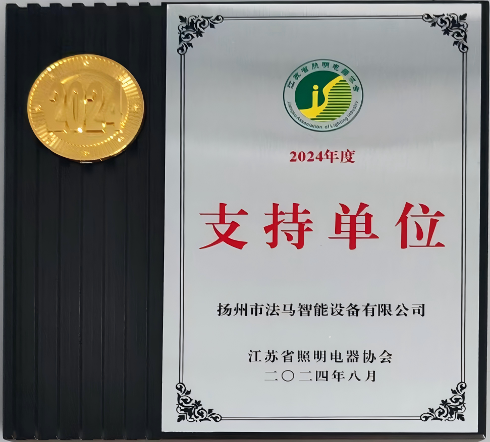 法馬交通憑借其創(chuàng)新的蔥郁智慧燈桿,在第七屆江蘇照明獎中榮獲優(yōu)質產(chǎn)品獎,并在頒獎現(xiàn)場同時榮獲了江蘇省照明電器協(xié)會頒發(fā)的2024年度支持單位榮譽。