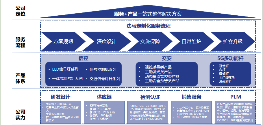 法馬交通以三大方案——智慧信控、智慧交安及5G智慧多功能桿為核心,并以“服務(wù)+產(chǎn)品一站式整體解決方案”為核心定位,同時(shí)法馬交通集合了研發(fā)設(shè)計(jì)、供應(yīng)鏈、檢測(cè)認(rèn)證、銷售服務(wù)及PLM管理的全方位實(shí)力,形成了完整的產(chǎn)品體系和定制化服務(wù)流程。