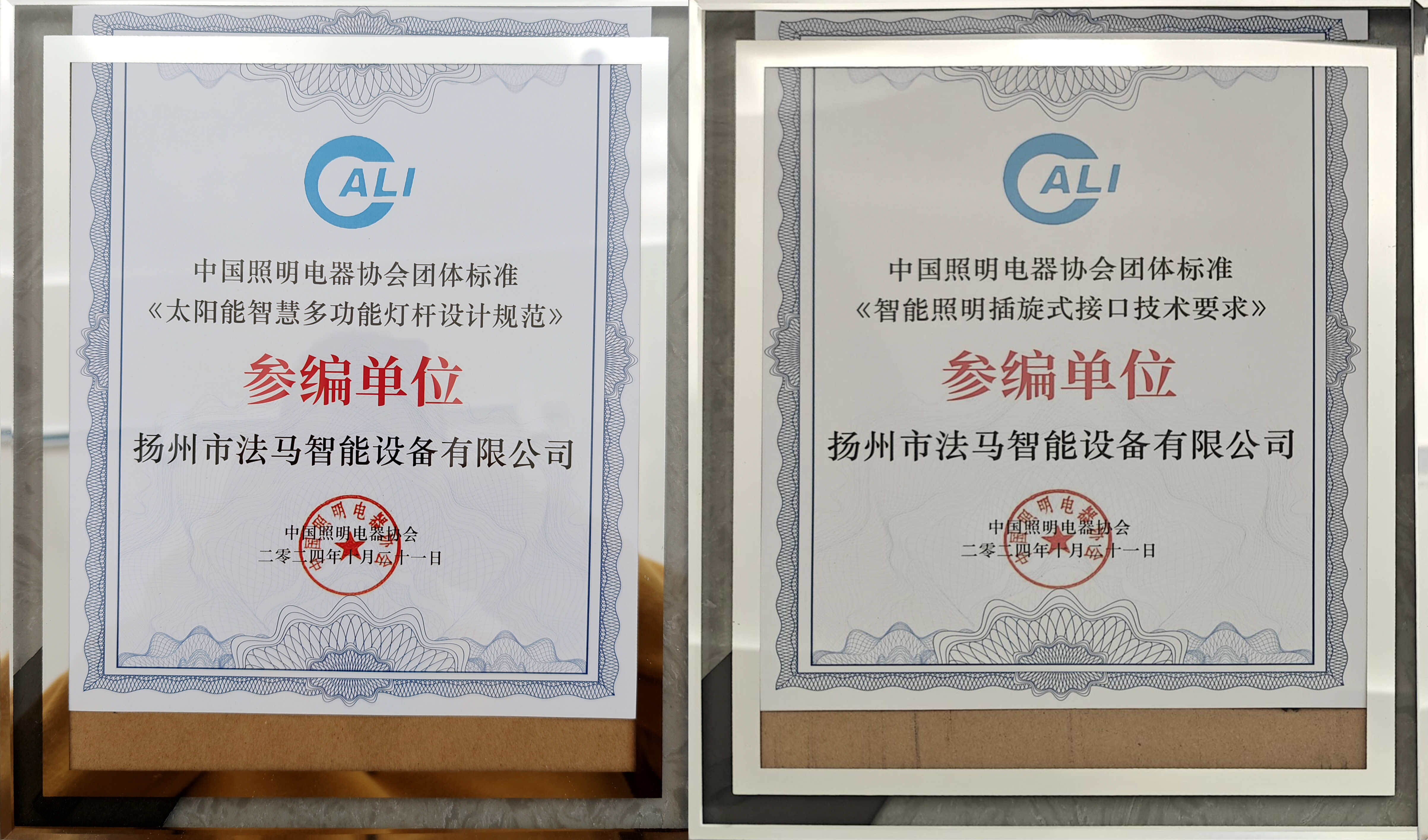 值得一提的是,法馬在此次大會(huì)上憑借在行業(yè)標(biāo)準(zhǔn)制定方面的突出貢獻(xiàn),榮獲了參編單位的頒發(fā)表彰。公司參與了《太陽(yáng)能智慧多功能燈桿技術(shù)規(guī)范》和《智能照明插旋式接口技術(shù)要求》兩項(xiàng)重要標(biāo)準(zhǔn)的編制工作。