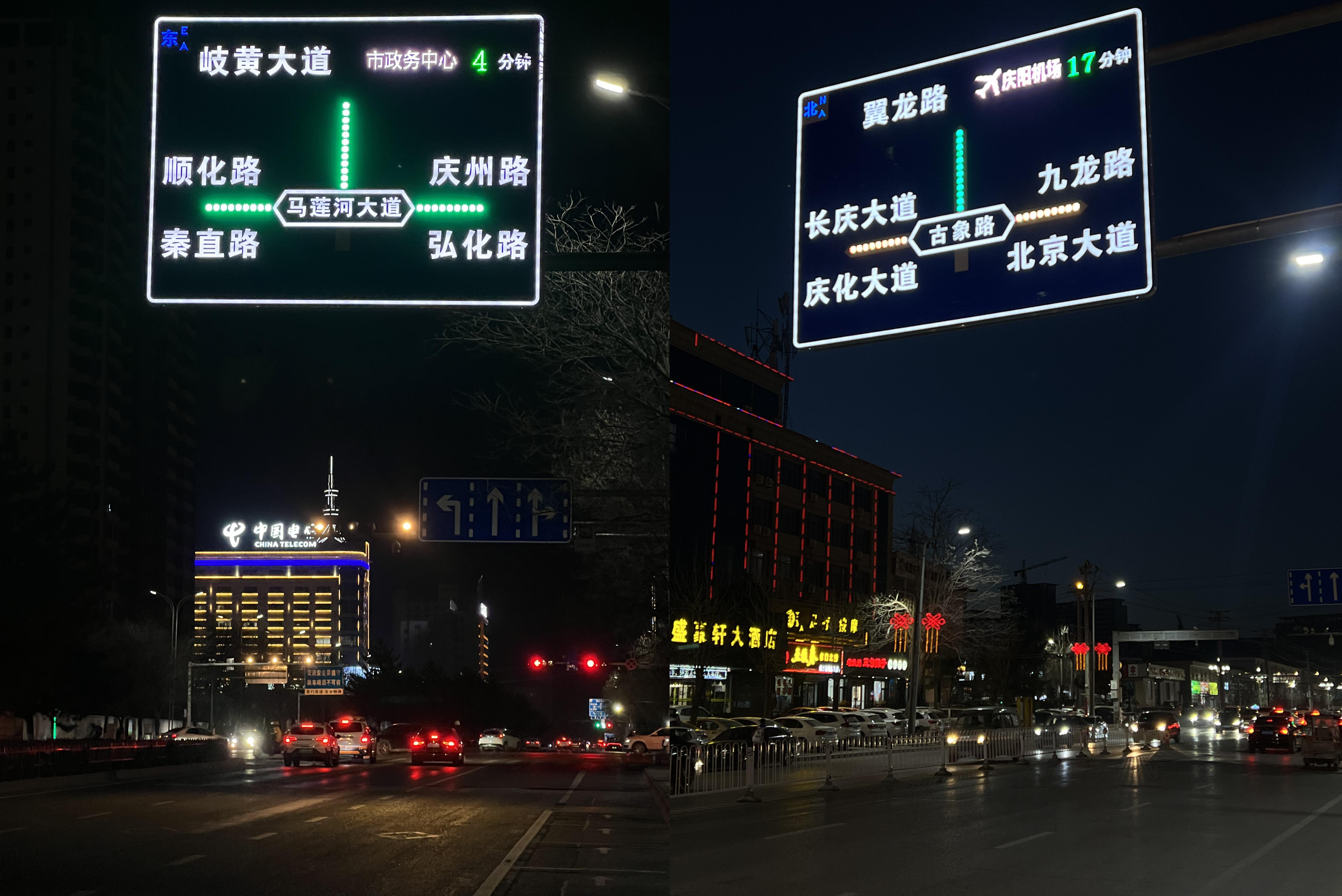 · LED文字屏:戶外P10 LED紅綠雙色模組,顯示節(jié)點(diǎn)到達(dá)通行分鐘數(shù)和動態(tài)文字信息,符合嚴(yán)格交通光學(xué)標(biāo)準(zhǔn),帶有遮光沿設(shè)計(jì)以優(yōu)化視覺效果。