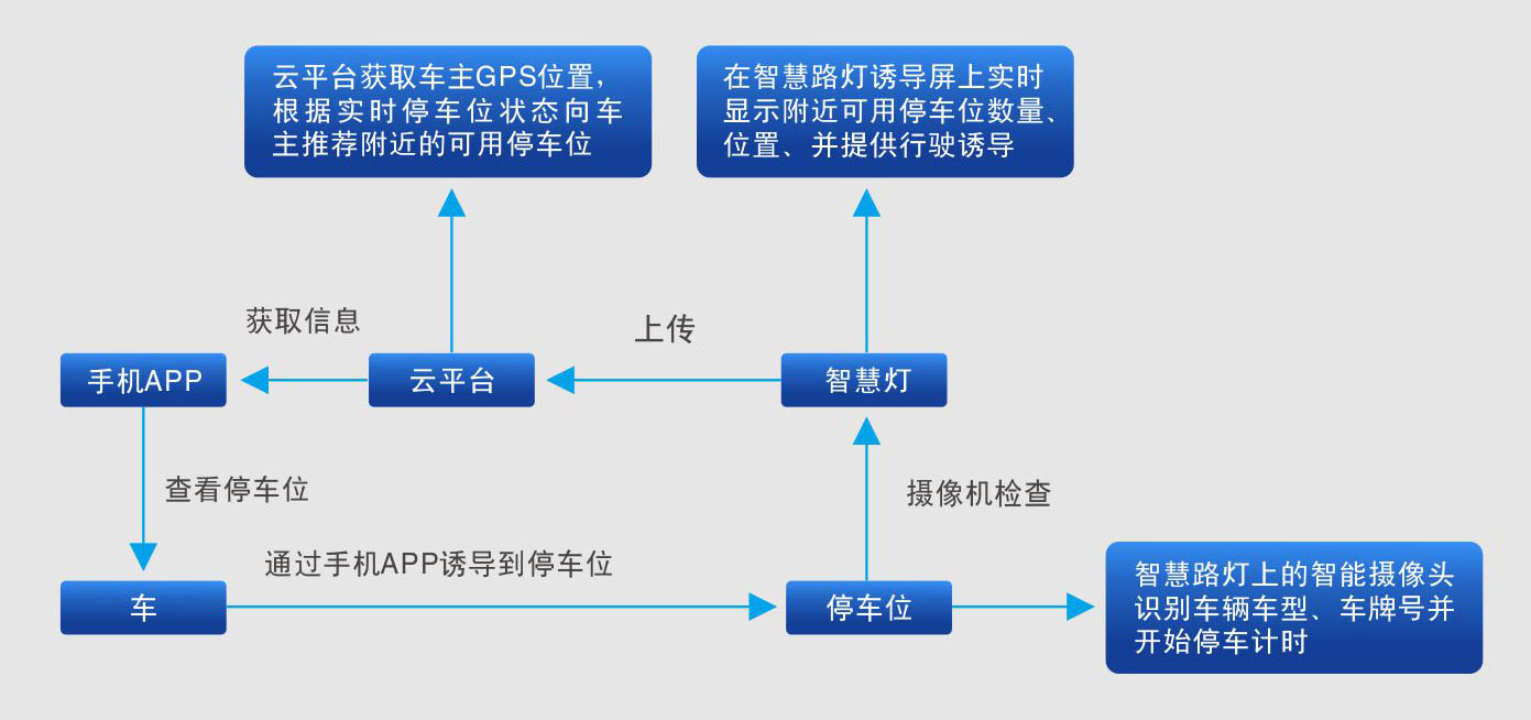 通過路燈桿上的傳感器,檢測車輛信息和停車位信息,有序安全管理停車