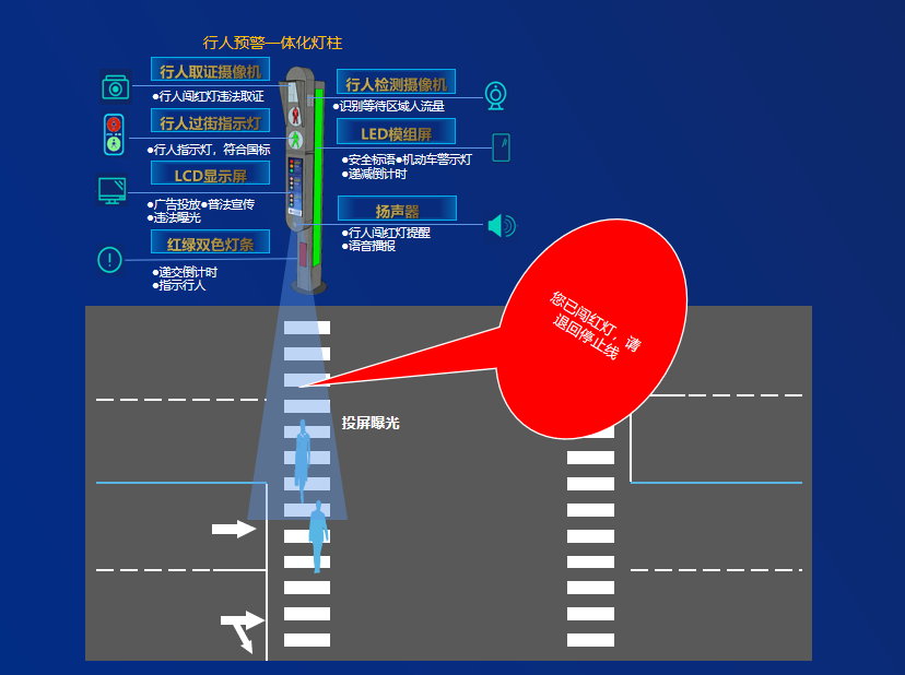 紅綠燈檢測器感知紅綠燈狀態(tài)、檢測相機抓拍行人闖紅燈行為、曝光屏曝光、語音喊話